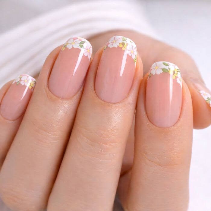 Ajoutez de petits motifs de fleurs sur la pointe ou en accent nail. Parfaite pour un look printanier ou bohème, elle apporte une touche fraîche et féminine.