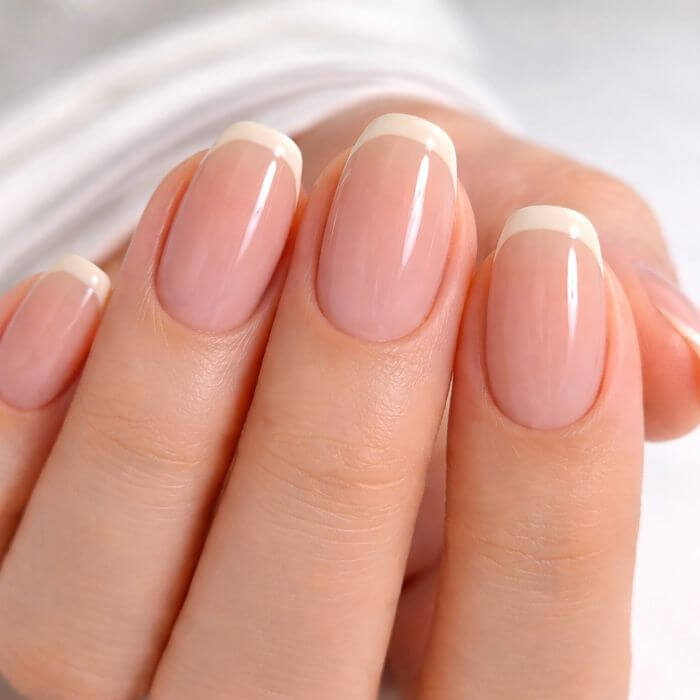 Ici, la pointe est réalisée dans une teinte proche de la base. Le rendu est subtil, lumineux et très sophistiqué. C’est une excellente option si vous souhaitez un effet “clean girl” ou une manucure élégante au quotidien.