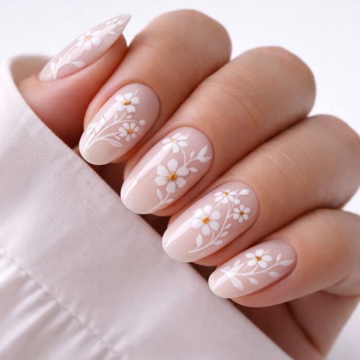 Vous pouvez varier les styles: fleurs minimalistes, marguerites, motifs vintage ou détails très fins. Ce style est particulièrement apprécié au printemps et en été.