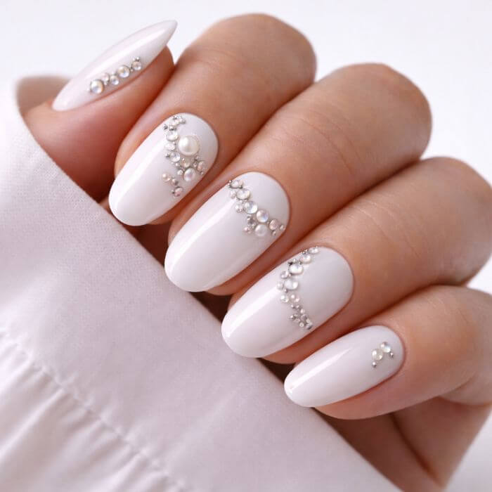 Pour une manucure sophistiquée, ajoutez des strass, des perles, des micro-bijoux ou des éléments en relief. Le contraste avec le blanc crée un effet chic et raffiné.