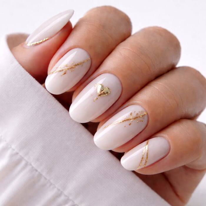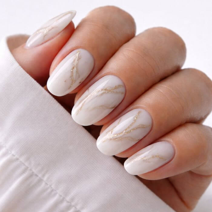 L’association du blanc et du doré est synonyme d’élégance. Ajoutez des touches métalliques, des feuilles d’or, des paillettes fines ou des lignes dorées pour sublimer votre manucure.