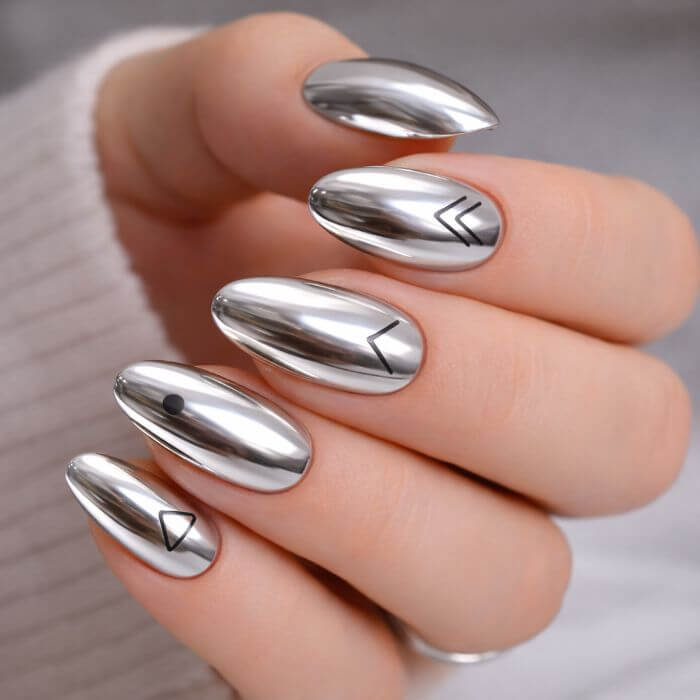 Associez l’effet chrome à des lignes fines, des formes géométriques ou des motifs abstraits. Vous pouvez jouer sur les contrastes entre mat et brillant.