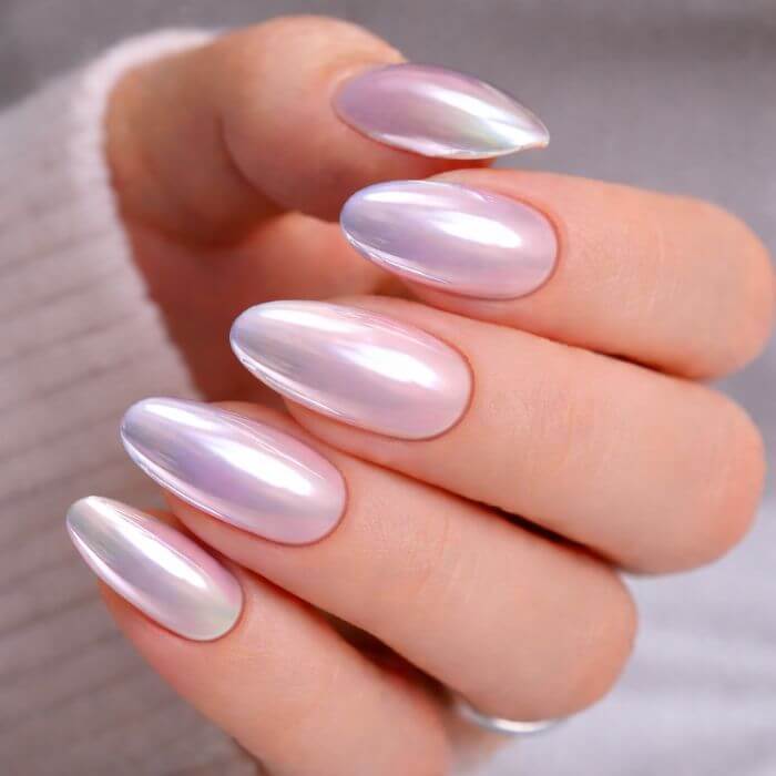 Très populaire, cet effet offre une finition nacrée légèrement chromée, souvent sur une base nude ou rosée.