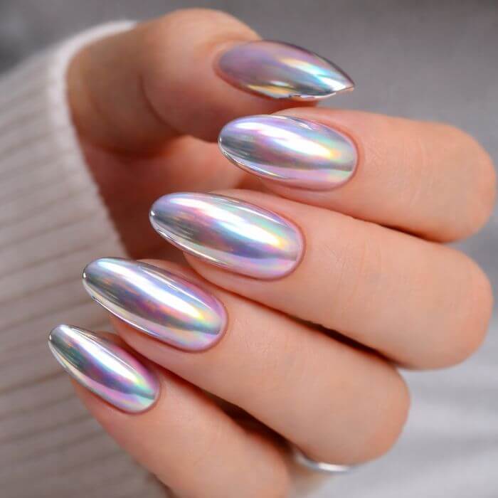 Le nail art chromé holographique reflète plusieurs couleurs selon la lumière et l’angle de vue. Il capte la lumière et crée un effet multidimensionnel fascinant.