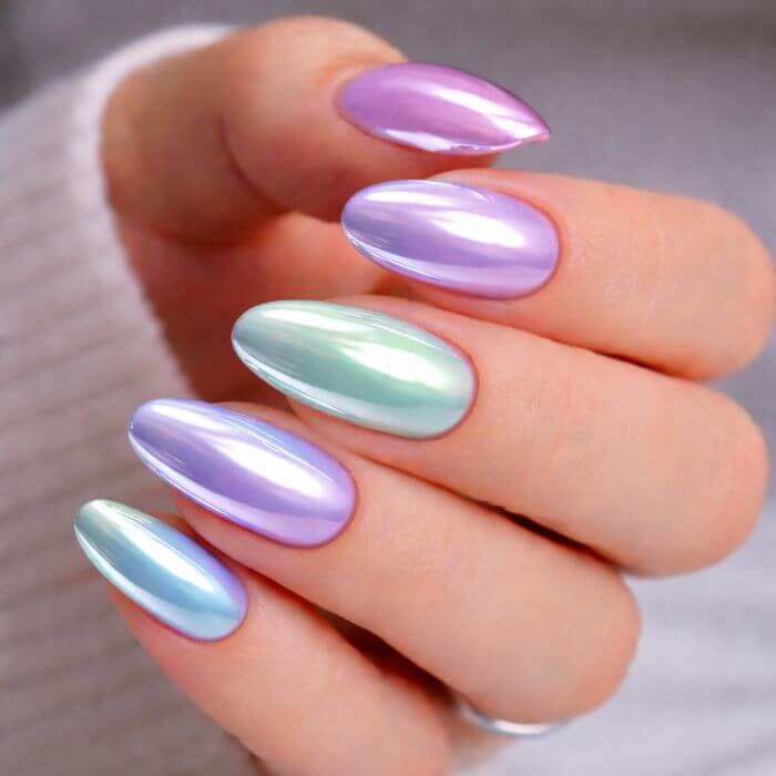 Les teintes pastel associées à un effet chrome donnent un résultat doux, lumineux et très féminin. Pensez au rose poudré, au lilas ou au bleu ciel.