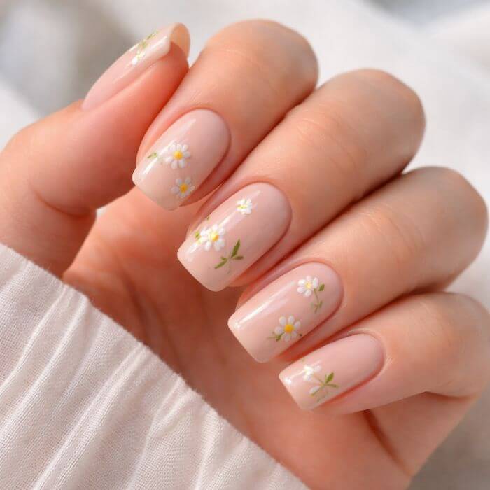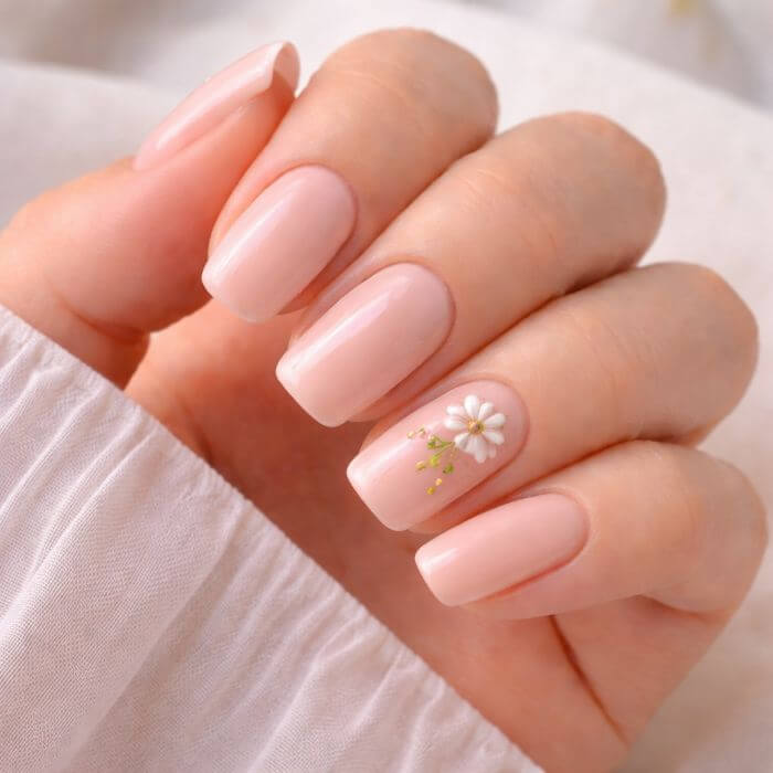 Le nail art fleur minimaliste est parfait si vous aimez les looks élégants et discrets. Il consiste à dessiner de petites fleurs, souvent blanches ou pastel, sur une base nude, rosée ou transparente.