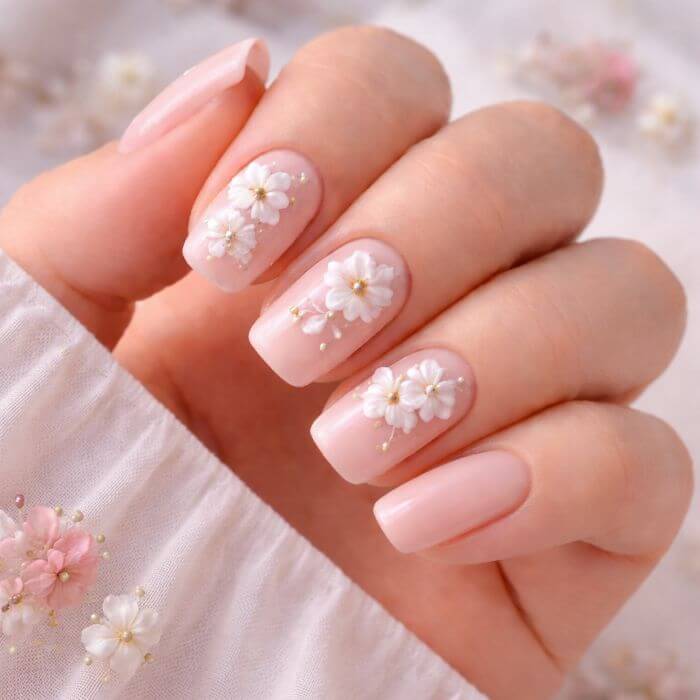 Le résultat est naturel, délicat et unique. Chaque manucure devient une petite œuvre d’art, car chaque fleur est différente. Ce style est particulièrement apprécié pour les événements comme les mariages ou les occasions spéciales.