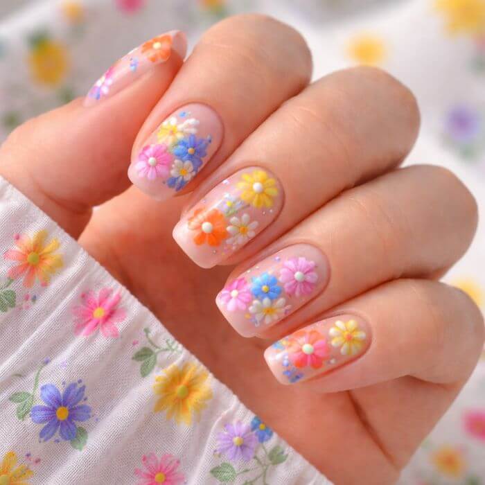Si vous aimez les looks fun et dynamiques, le nail art floral multicolore est fait pour vous. Mélangez différentes teintes vives comme le jaune, le fuchsia, l’orange ou le turquoise pour créer des fleurs joyeuses et originales.