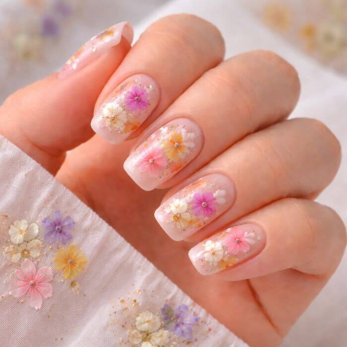 Très tendance, le nail art floral avec fleurs séchées consiste à intégrer de véritables fleurs dans le gel ou le vernis semi-permanent.