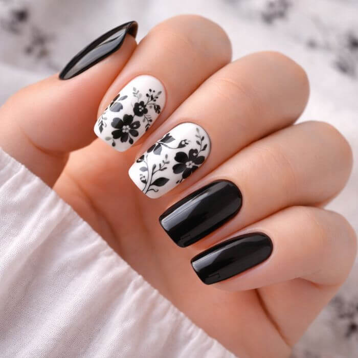 Nail art floral noir et blanc