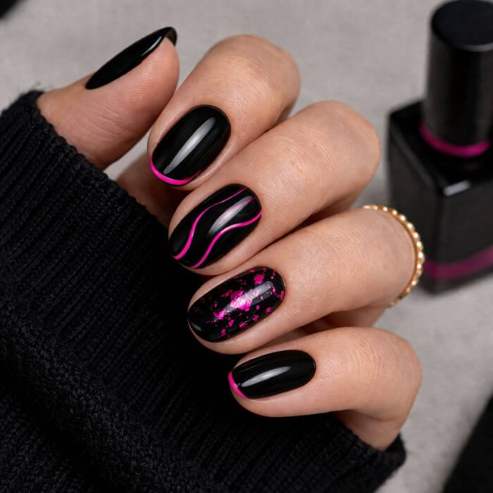 💡 Idée: un ongle noir avec un motif coloré ou des détails graphiques.