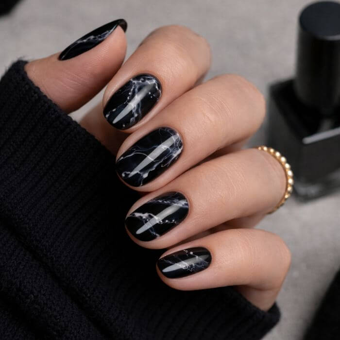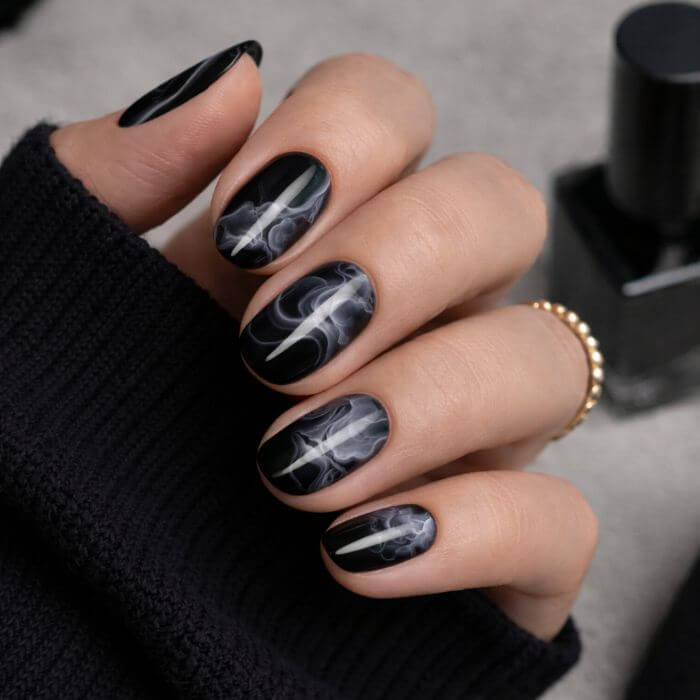 Le marbré noir donne un aspect artistique et unique à chaque ongle. Aucun design ne se ressemble.