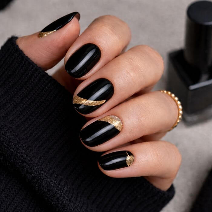 L’association noir et doré est synonyme de luxe. Quelques touches de foil, de paillettes ou de lignes dorées suffisent à illuminer votre manucure.