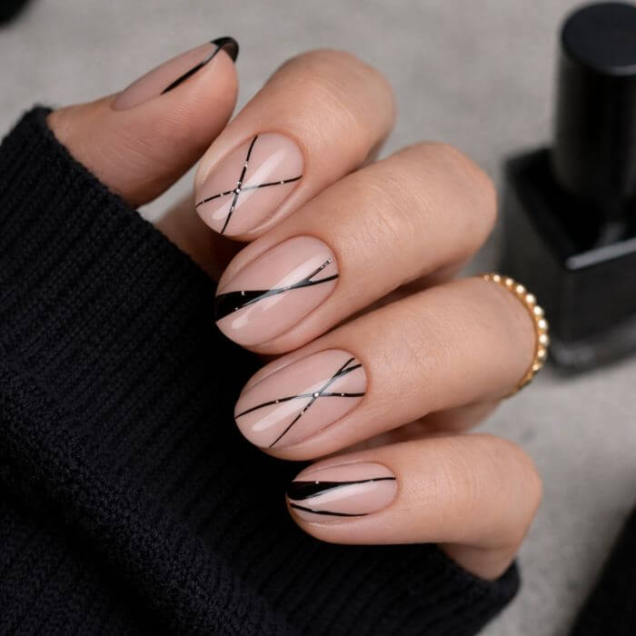 Les lignes noires sur une base nude ou transparente sont parfaites pour un look minimaliste et artistique. Elles structurent l’ongle tout en restant élégantes.