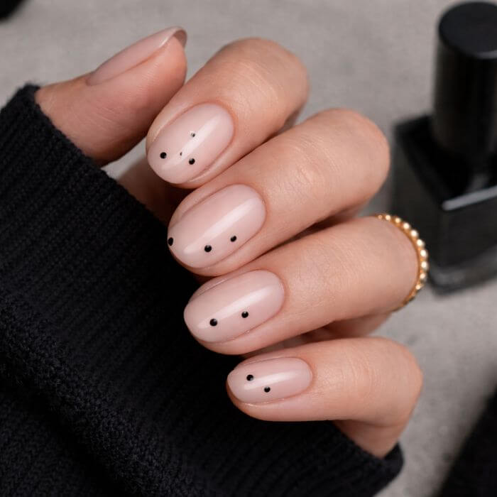 Quelques pois noirs suffisent à créer une manucure subtile et féminine. Ils apportent une touche rétro très douce.