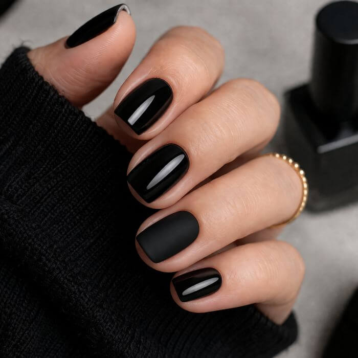 💡 Idée: ajoutez une fine ligne argentée sur un ongle noir mat.